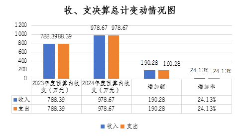 2024年度收、支總計(jì)均為978.67萬(wàn)元。與2023年度相比,2024年度預(yù)算收入978.67萬(wàn)元,比上年預(yù)算收入788.39萬(wàn)元增加190.28萬(wàn)元,增加24.13%,收入增加的主要原因是:財(cái)政追加“巴適購(gòu)”電商平臺(tái)建設(shè)補(bǔ)助、革命老區(qū)重點(diǎn)城市對(duì)口合作(金華-巴中)等企業(yè)發(fā)展資金項(xiàng)目;增人增資及社會(huì)保障繳費(fèi)預(yù)算收入總數(shù)增加等。