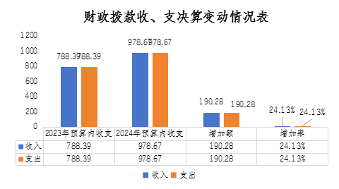 2024年度財(cái)政撥款收、支總計(jì)均為978.67萬(wàn)元。與2023年度相比,2024年度預(yù)算收入978.67萬(wàn)元,比上年預(yù)算收入788.39萬(wàn)元增加190.28萬(wàn)元,增加24.13%,收入、支出增加的主要原因是:財(cái)政追加“巴適購(gòu)”電商平臺(tái)建設(shè)補(bǔ)助、革命老區(qū)重點(diǎn)城市對(duì)口合作(金華-巴中)等企業(yè)發(fā)展資金項(xiàng)目;增人增資及社會(huì)保障繳費(fèi)預(yù)算收入總數(shù)增加,年末沒(méi)有資金結(jié)轉(zhuǎn)到下年等原因。