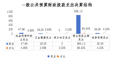 2024年一般公共預(yù)算財(cái)政撥款支出978.67萬(wàn)元,主要用于以下方面:社會(huì)保障和就業(yè)支出47.86萬(wàn)元,占總支出的4.89%;衛(wèi)生健康支出26.29萬(wàn)元,占總支出的2.69%;商業(yè)服務(wù)業(yè)等支出865.13萬(wàn)元,占總支出的88.40%;住房保障支出39.39萬(wàn)元,占總支出的4.02%。
